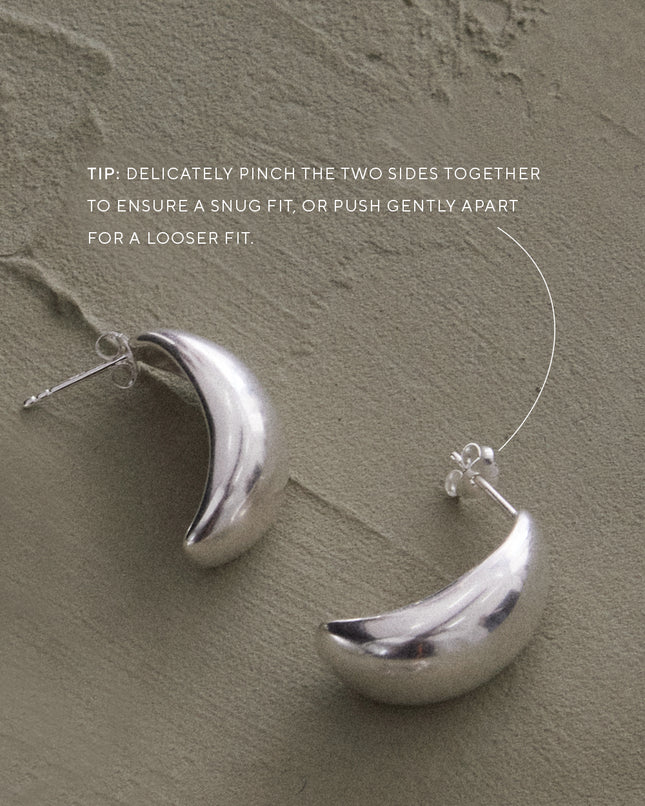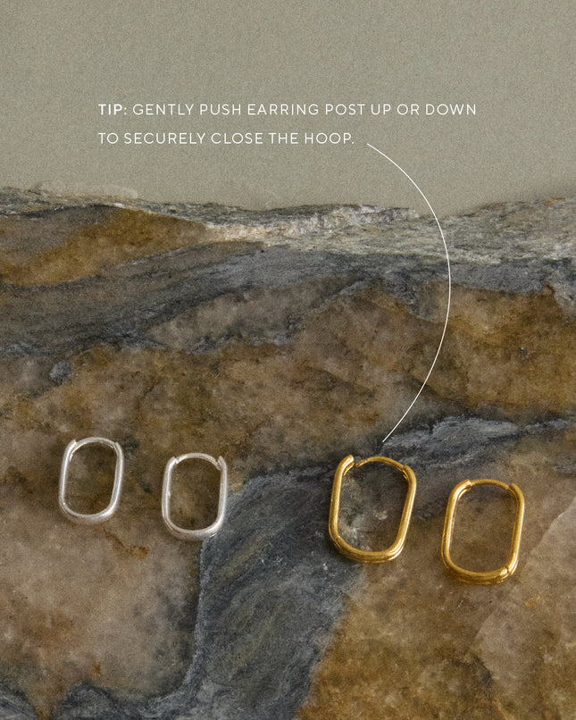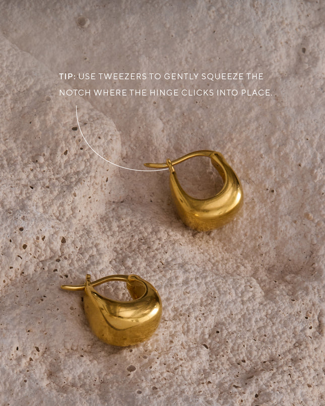 To maintain their durability, treat your hoops with care. To open them, hold each side and gently pull them apart. If you find the earring isn’t quite clicking shut, it is likely the earring post is misaligned. To fix this, gently push the post up or down towards the groove using your fingers or tweezers. Ensure the post hinge aligns with the receiving hole or groove when closing the earring and listen for a little click sound, this should now be secure.