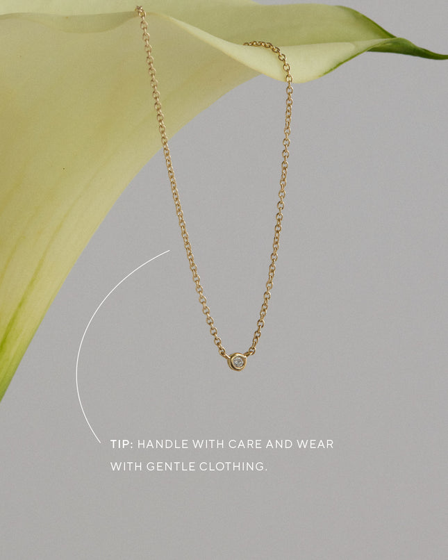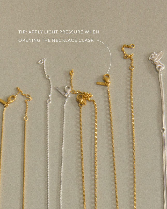 Crafted with delicate links, our signature fine chain requires gentle handling to prevent tangling and avoid stretching. The primary cause of breakage in our necklaces and bracelets is often due to stretching. Made from solid gold and sterling silver—both malleable materials—they can elongate over time from regular wear or accidental snagging.