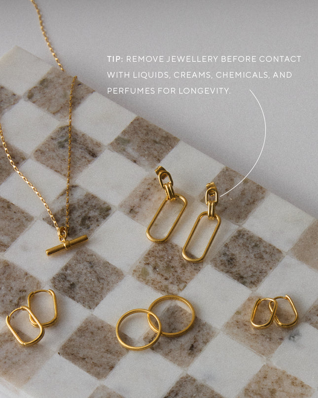 Our 18k gold-plated pieces use a sterling silver base, with a gold layer of 1.5-2 microns. While this exceeds the industry standard and offers extended durability, for optimal longevity, we recommend the following: Remove your jewellery when swimming, sleeping, showering, or bathing, as exposure to salt, creams, and washing products can damage its surface.