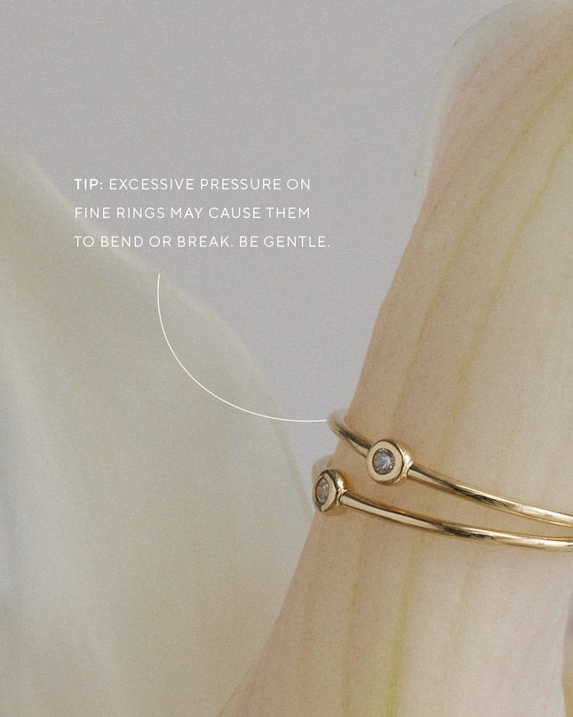 Crafted from delicate precious metal wire, our fine rings require gentle handling to maintain their shape and beauty. Please handle your rings with care, as excessive pressure may cause the wire to bend or break.