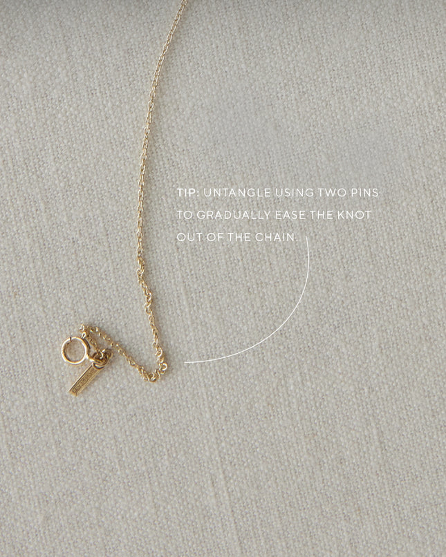 Found your chain in a tangle? Work to untangle it straight away to prevent any stretching. We suggest using two pins on a flat, sturdy surface to carefully work through the knot. Begin at the centre of the tangle to gradually ease the chain. As the knot loosens and opens up, gently manoeuvre the pins away from the tightest spot to unravel the tangle.