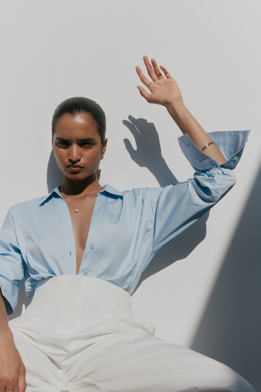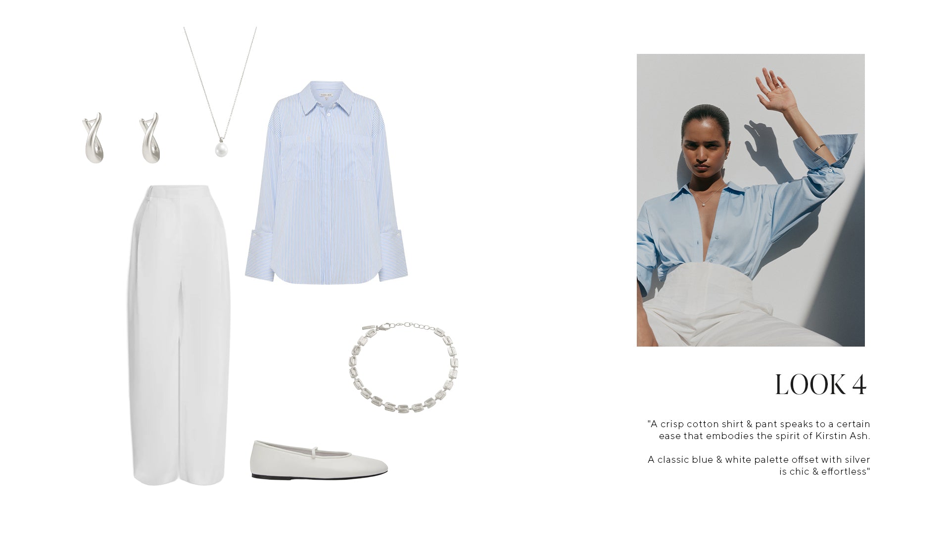KIRSTIN ASH MARIS PEARL NECKLACE, SHONA JOY SHIRT, KIRSTIN ASH ARISE EARRINGS, KIRSTIN ASH MONDO BRACELET, TONY BIANCO FLATS, VENROY PANTS